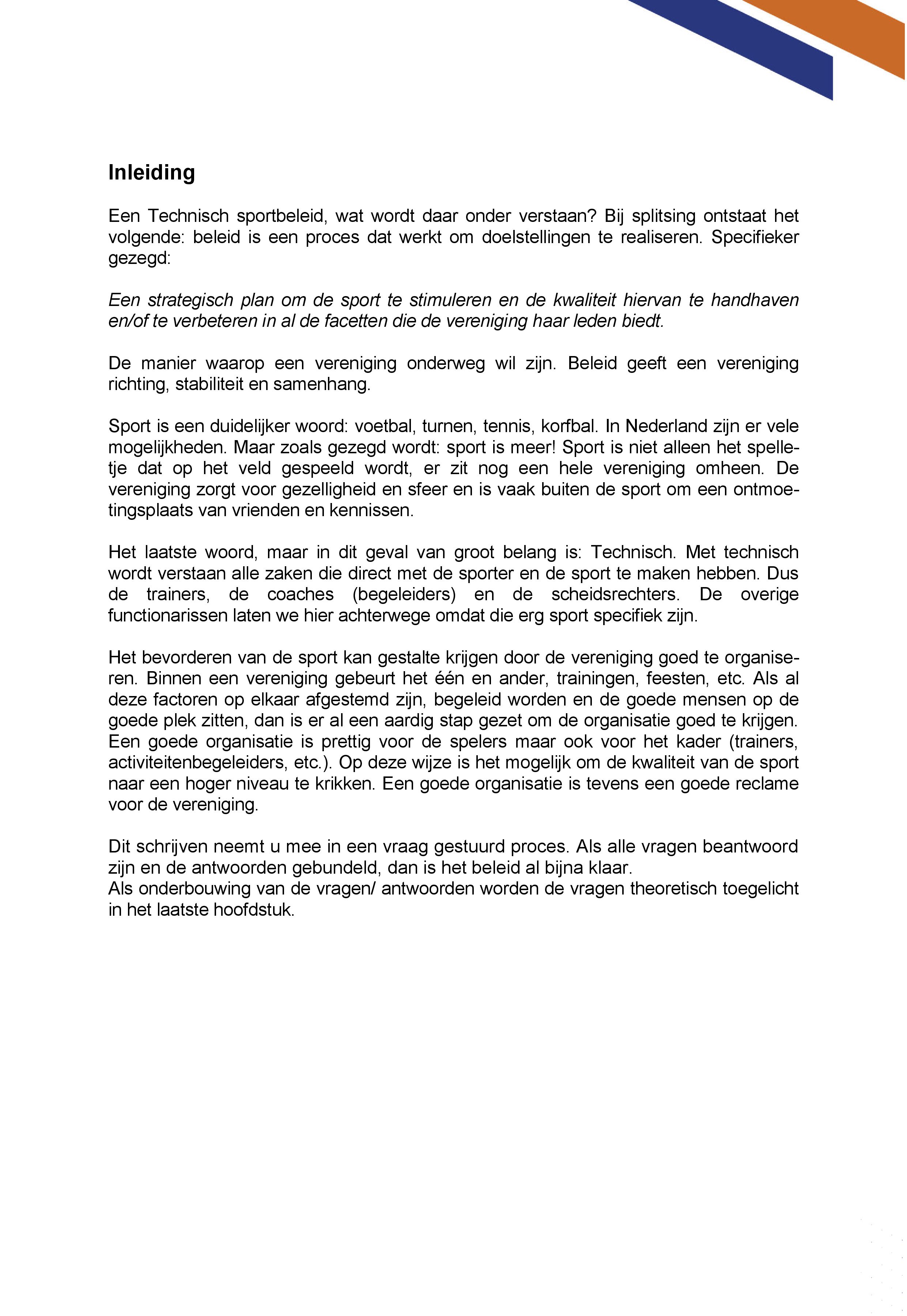 Technisch sportbeleid maken is geen dagelijks werk voor de meeste vrijwilligers. Houvast is mooi meegenomen en scheelt veel werk. Dit document is een vraag gestuurde leidraad om het Technische beleid voor de sportvereniging vorm te geven. Stapsgewijs doornemen en de vragen beantwoorden resulteert in een Technisch sportbeleid. Voor enige diepgang zijn hoofdstukken toegevoegd met achtergrond informatie. Ook is het mogelijk om er een workshop aan te verbinden zodat je als vereniging meteen goed uit de startblokken kunt. De workshop wordt bij uw vereniging gehouden. Tevens kan er online begeleiding geregeld worden.
